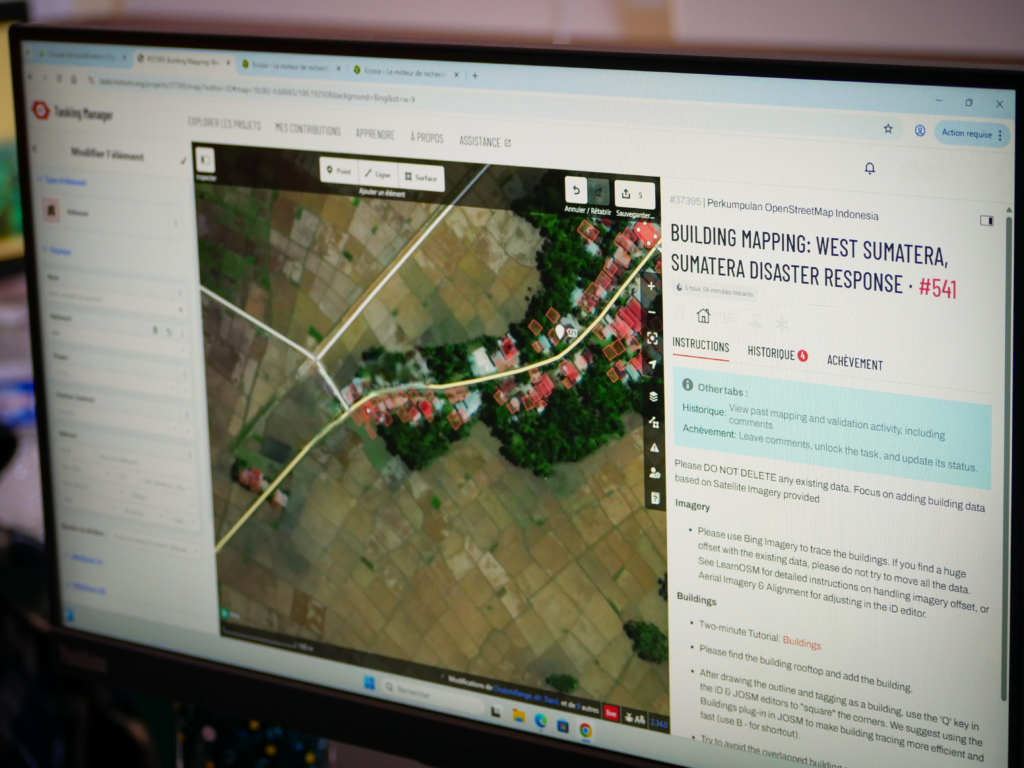 À partir d’images satellites et d’outils collaboratifs en ligne, les participants devaient repérer, dessiner et valider les contours de bâtiments dans des zones du monde où les cartes sont encore incomplètes. Derrière ces polygones et ces tracés, une réalité très concrète : permettre aux organisations humanitaires de mieux connaître le terrain sur lequel elles interviennent.
