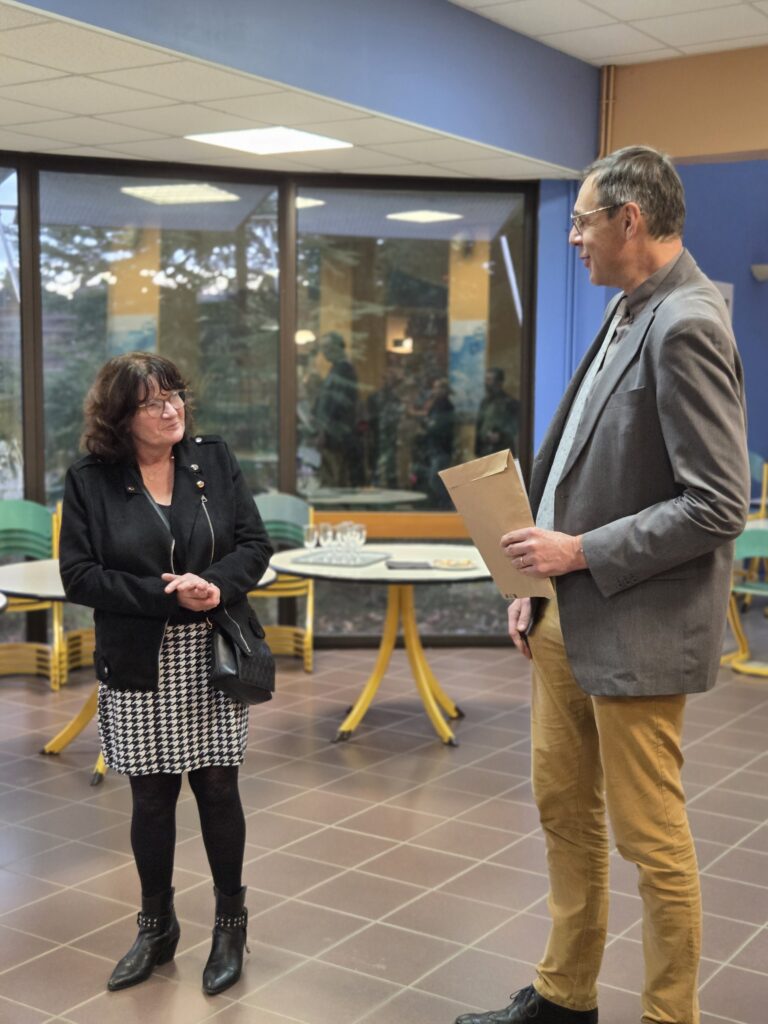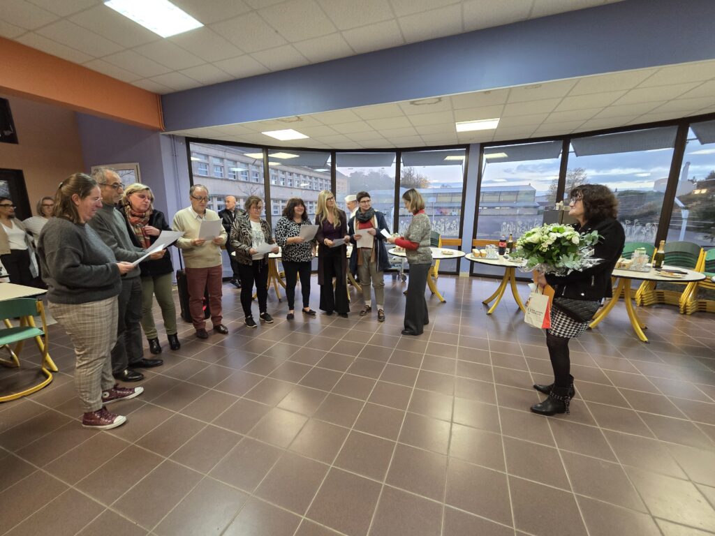 Le 3 novembre dernier, nous lui avons rendu hommage lors d’une soirée pleine d’émotions : la chorale adulte Grain d’phonie lui a dédié une chanson, tandis que M. DUPERRON a retracé avec justesse et chaleur le long parcours de Lise et son engagement sans faille. Les sourires, les applaudissements et les mots touchants de ses collègues traduisent la reconnaissance de tous.